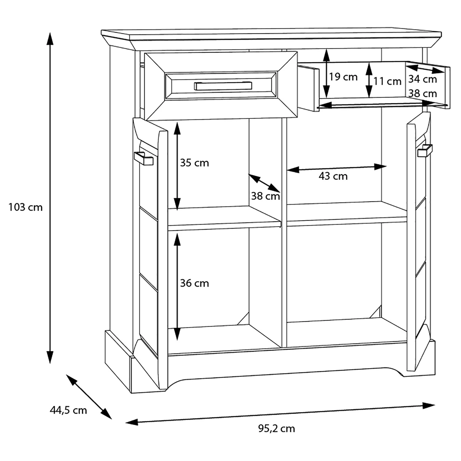 - Dimensions intérieures du tiroir : 38 x 34 cm chaque